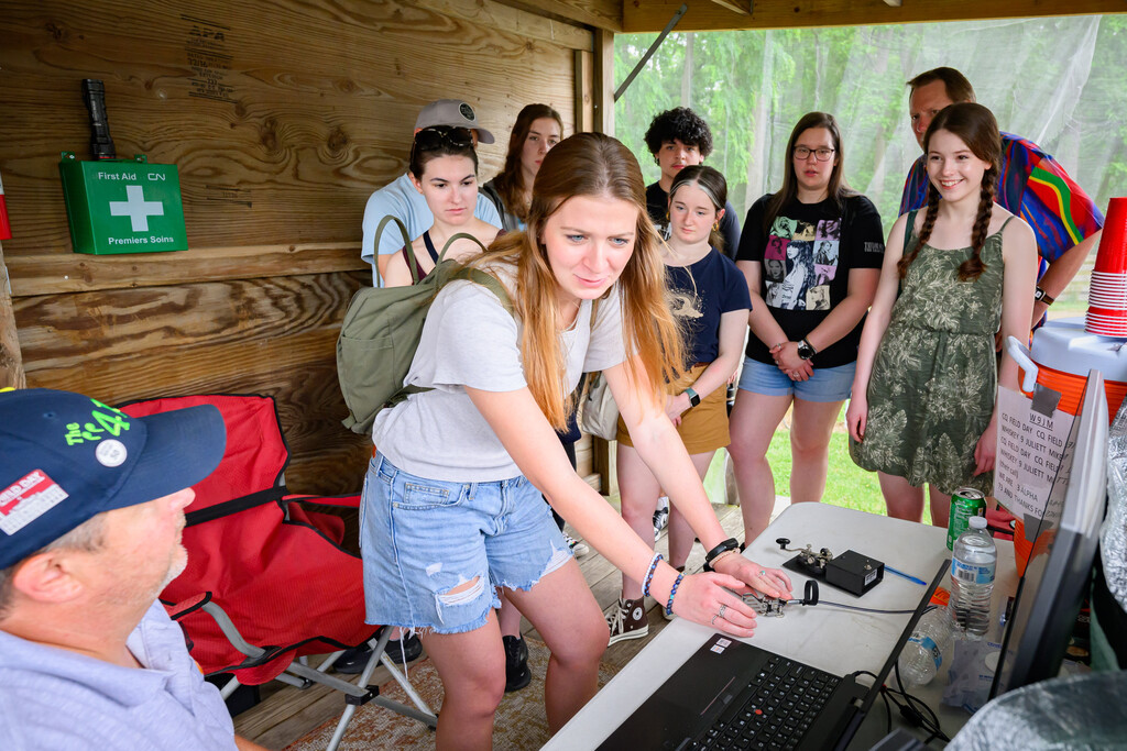 After welcoming the group to the event, Field Day Director Sam Haldiman gave an overview of the Field Day operation and all the station locations. Then, Sam guided Tess and the cast of Static into the Get-On-The-Air (GOTA) Station where they saw HF phone and FT-8 operations. Several of the cast and crew members tried their hand at โsendingโ CQ with a straight key and a paddle. Turns out, it was not as easy as it looked. Others took turns calling โCQ Field Dayโ and logging their very first amateur radio contacts. Then, the team was guided to Ralph Iden (WB9ICF) and the CW Station where they learned about the history of Morse Code and the equipment used to send the signal. Examples of straight keys, bugs, paddles and computer software were demonstrated and discussed. Finally, the group was guided to the Comms Trailer to learn about VHF and Digital stations. They were particularly interested in the QSL card collection on the wall. Tess and the cast created a version of their own QSL Card which includes information about the upcoming run of shows at the Raue Center.